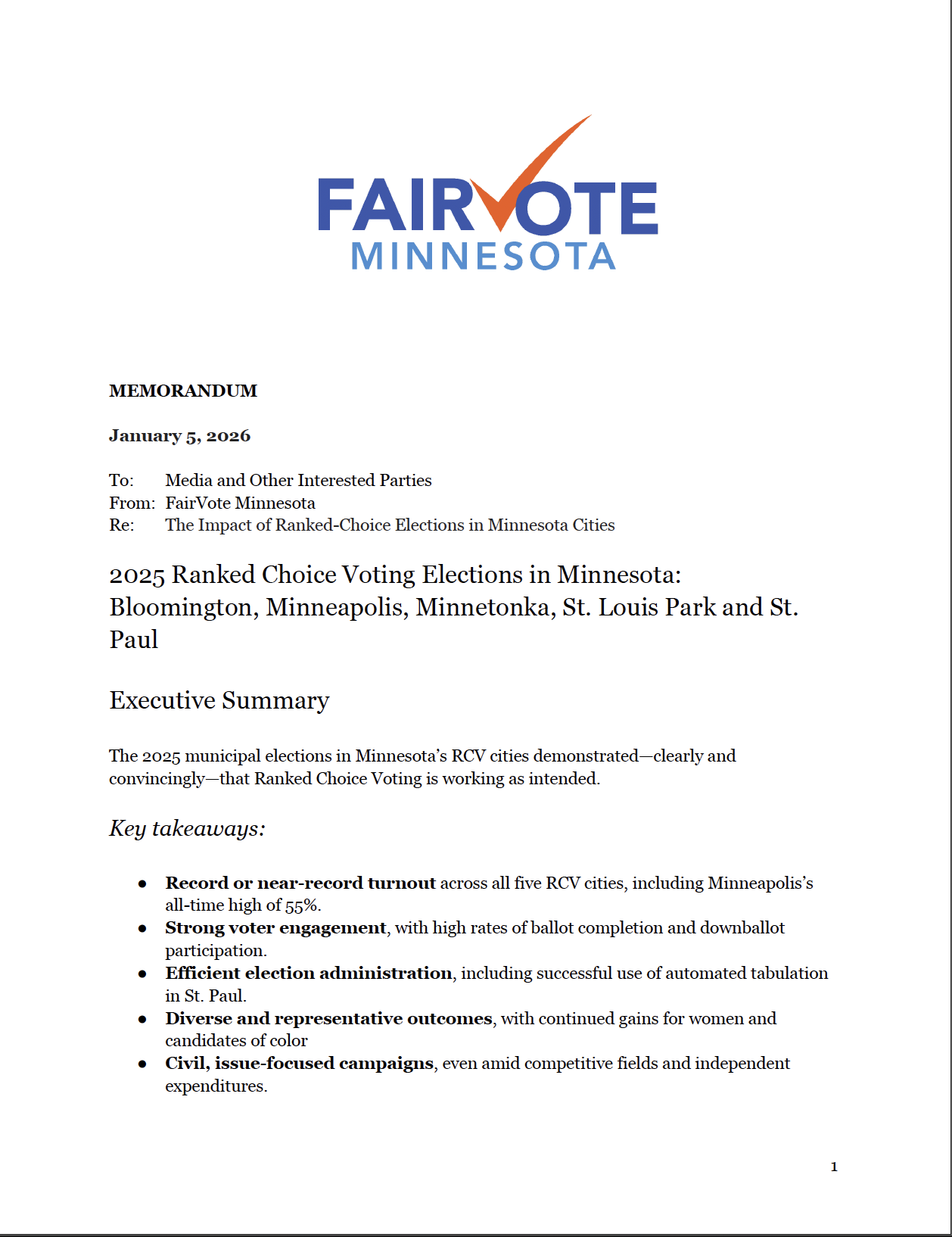 Ranked Choice Voting in Minnesota Cities Ranked choice voting in Minnesota. A decade’s worth of progress made and lessons learned. 2025 Election Overview: Key Takeaways in Minnesota's Five RCV Cities RCV Exit Polls: Voters Across the Country prefer RCV 2023 RCV Election Overview: Executive Summary for Bloomington, Minneapolis, Minnetonka, Saint Louis Park, and St. Paul 2021 RCV Election Overview: Executive Summary for Bloomington, Minneapolis, Minnetonka, Saint Louis Park, and St. Paul RCV By the Numbers – 2021 Key Election Findings: Minneapolis RCV by the Numbers – 2021 Key Election Findings: Bloomington Ranked Choice Voting in MN Cities Fact Sheet 2019. RCV by the Numbers - St. Louis Park and St. Paul 2017. RCV Election Overview - Minneapolis and St. Paul 2017. RCV by the Numbers - Minneapolis 2017. RCV by the Numbers - St. Paul 2015. RCV by the Numbers - St. Paul Ward 2 2013. RCV by the Numbers - St. Paul Ward 1 2013. RCV by the Numbers - Minneapolis 2009. One Defective Ballot in Minneapolis and Other Facts